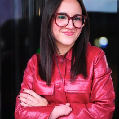 Imagen de una mujer joven con gafas de pasta oscuras y el pelo castaño oscuro liso suelto mira a camara sonriendo. Lleva una chaqueta roja y cruza los brazos a la altura del pecho.