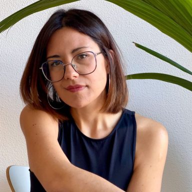 Imagen de una mujer joven co los ojos marrones y el pelo castaño liso a la altura de los hombros. Lleva unas gafas de montura fina estilo aviador y viste una camiseta negra de tirante ancho. Sonríe suavemente mirando a cámara.