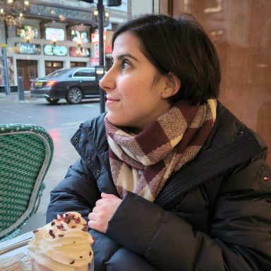 Imagen de una mujer joven con los ojos marrones y el pelo castaño al estilo bob corto. Está sentada junto a la ventana de una cafetería, girada hacia la izquierda y sonríe ligeramente. Lleva una bufanda de cuadros rojos oscuros, rojos un poco más claros y blancos, y un chaquetón azul oscuro