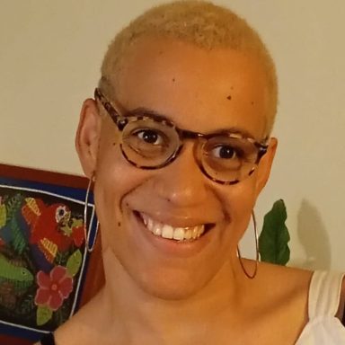 Imagen de una mujer joven mestiza con ojos negros y gafas de pasta amarillas animal print y el pelo corto y rubio. Lleva unos pendientes de aro medianos y está sonriendo mirando a cámara.