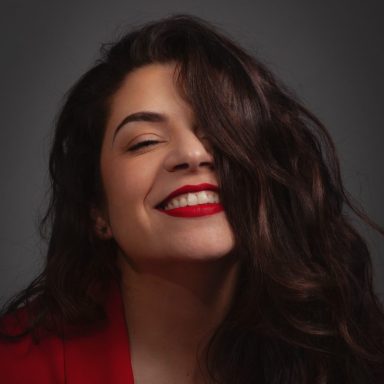 Imagen de una mujer joven con los ojos cerrados y el pelo castaño oscuro, largo y ondulado que le cae cubriendo la mitad de la cara. Lleva una chaqueta roja y sonríe en dirección a la cámara.